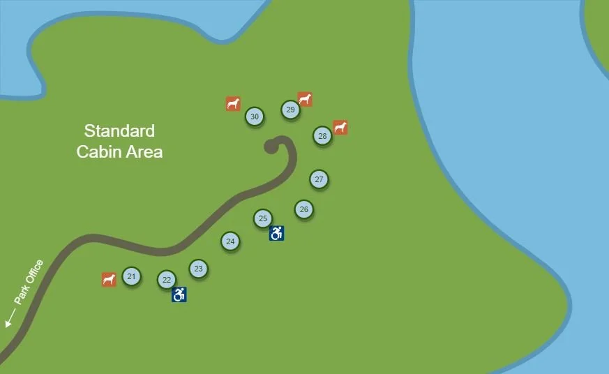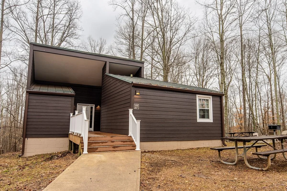 There are 10 3-bedroom cabins with modern amenities such as full kitchens, mini-split Air conditioning, stone firepits, and more. These cabins are located a quick 5 minute drive away from the Tea Room on the other side of the dam. If your Cabin is numbered 21-30, one of these bad boys are for you!